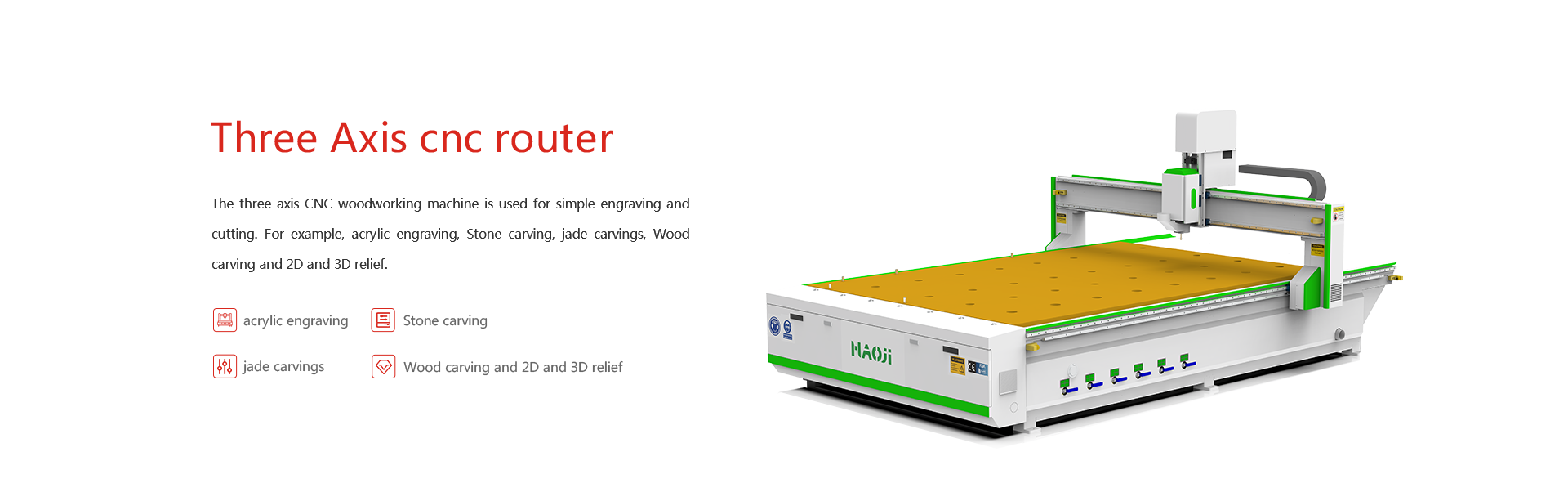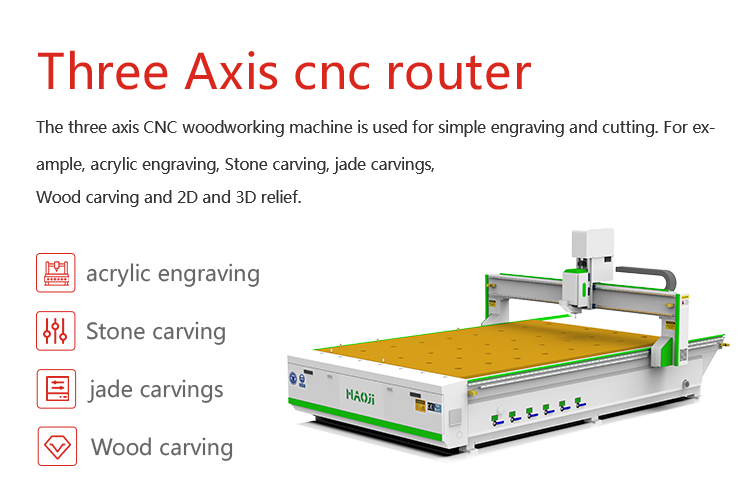 The three axis CNC woodworking machine is used for simple engraving and cutting. For example, acrylic engraving, Stone carving, jade carvings, Wood carving and 2D and 3D relief.